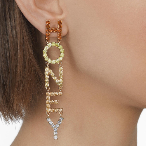 Turn heads and say it with your chest. The Honey Drip Statement Earrings feature bold, crystal-encrusted lettering that spells HONEY from top to bottom, delivering glam, confidence, and main-character energy in every step. Finished in warm gold tones with sparkling stones, these earrings are made to shine from every angle.
