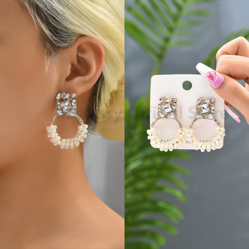 Bring luxurious sparkle to your look with our Royale Beaded Hoop Earrings. Designed to turn heads, these earrings feature a stunning top cluster of emerald-cut and teardrop gems in White tones, set in a rich gold frame. The beaded hoop below is wrapped in matching faceted white beads, adding texture, shine, and elegant movement with every step.