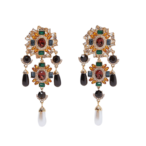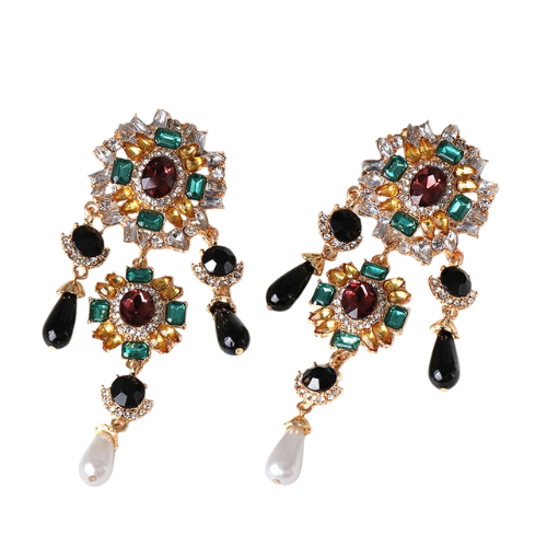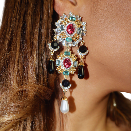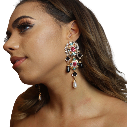 These stunning chandelier earrings are designed to captivate. Featuring an intricate arrangement of emerald, ruby, amber, and clear gemstones, each piece blooms with rich color and regal detail. Black teardrop crystals add dramatic depth, while the pearl drop at the bottom gives the perfect elegant finish. These earrings deliver couture-level glamour—ideal for events, photoshoots, or elevating any night-out look.