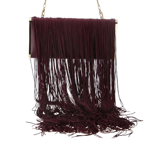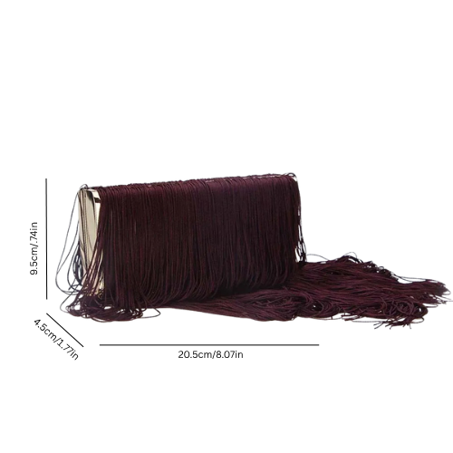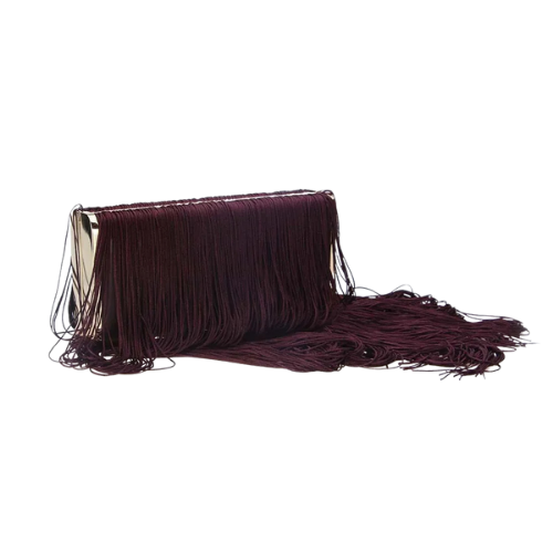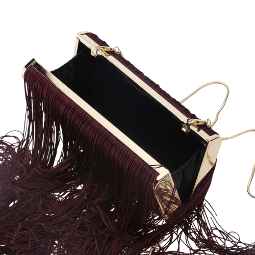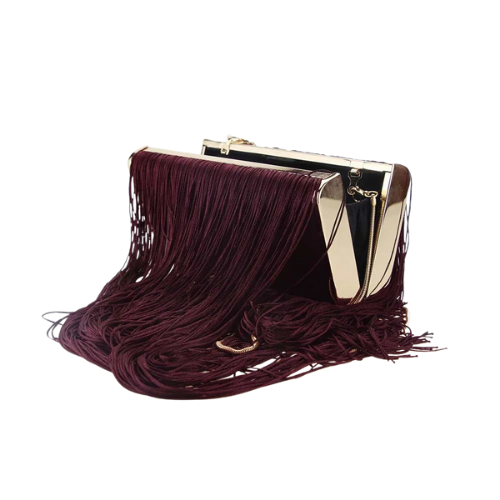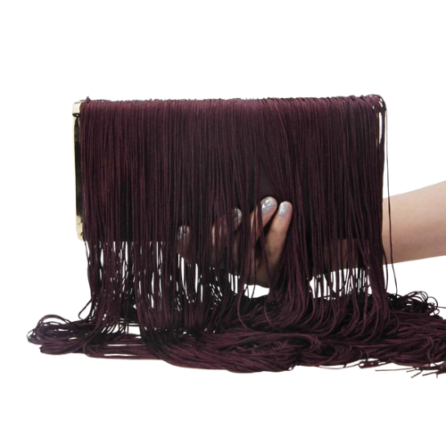 Make an unforgettable entrance with our Burgundy Fringe Statement Clutch—a bold, dramatic accessory designed for the fashion-lover who isn’t afraid to stand out. Thousands of silky burgundy fringe strands drape elegantly from the structured frame, creating luxurious movement with every step.