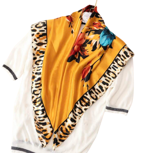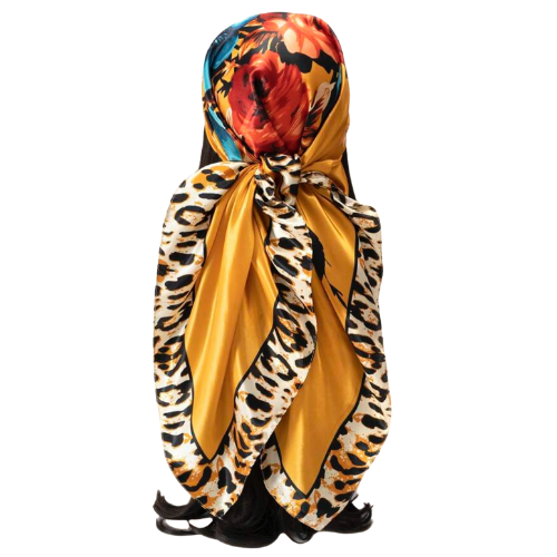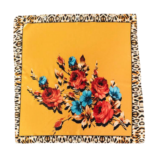 Make a fierce, vibrant statement with our Wild Bloom Satin Scarf, where bold florals meet a striking leopard-print border. This scarf features a rich golden-yellow base adorned with red and turquoise blossoms—creating the perfect blend of feminine elegance and wild, runway-ready energy.