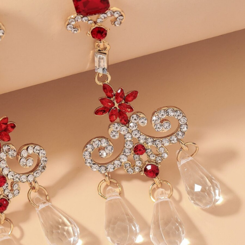 Add a touch of timeless glamour with our Ruby Radiance Crystal Chandelier Earrings. Designed to captivate, these earrings blend rich ruby-red stones with sparkling clear crystals for a luxurious, high-fashion finish. The ornate gold-tone scrollwork creates a vintage-inspired silhouette, while the cascading teardrop crystals add graceful movement and eye-catching shine.