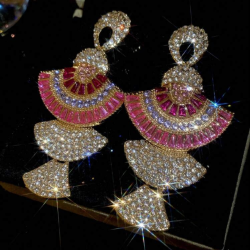 Make an unforgettable entrance with our Crystal Diva Fan Statement Earrings, crafted for the woman who loves maximum sparkle and show-stopping style. These earrings feature a stunning fan-shaped, tiered design encrusted with hundreds of shimmering crystals. Rich pink baguette stones add a vibrant pop of color, while clear pavé stones create a high-shine, red-carpet glow from every angle.