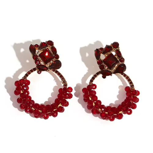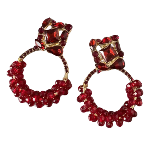 Bring luxurious sparkle to your look with our Royale Beaded Hoop Earrings. Designed to turn heads, these earrings feature a stunning top cluster of emerald-cut and teardrop gems in deep red tones, set in a rich gold frame. The beaded hoop below is wrapped in matching faceted red beads, adding texture, shine, and elegant movement with every step.