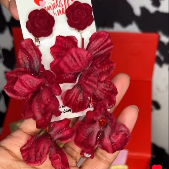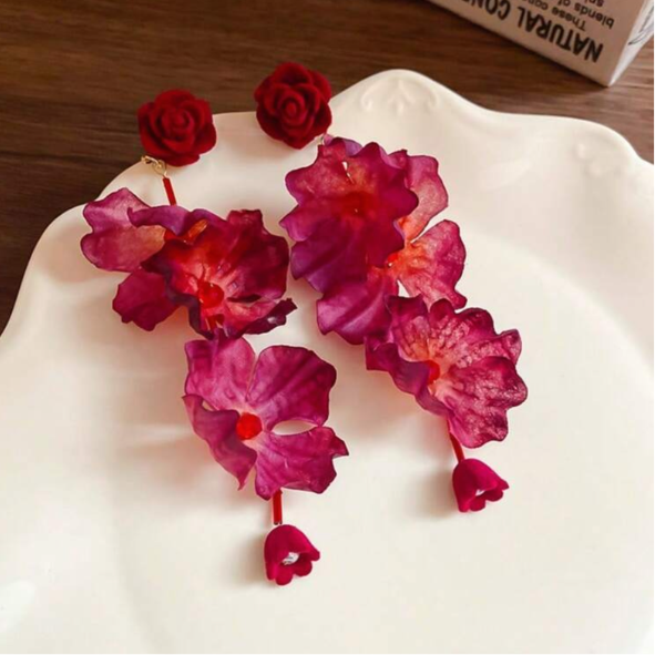 Romantic, bold, and beautifully expressive, our Blooming Rose Drop Earrings are designed to make a statement. Featuring layered floral petals in rich shades of crimson and berry, these earrings create a soft yet dramatic silhouette that moves gracefully with you. Finished with delicate rose studs and dangling floral accents, they bring an elegant, feminine touch to any look.