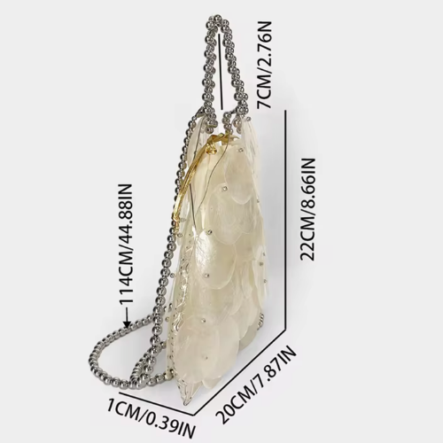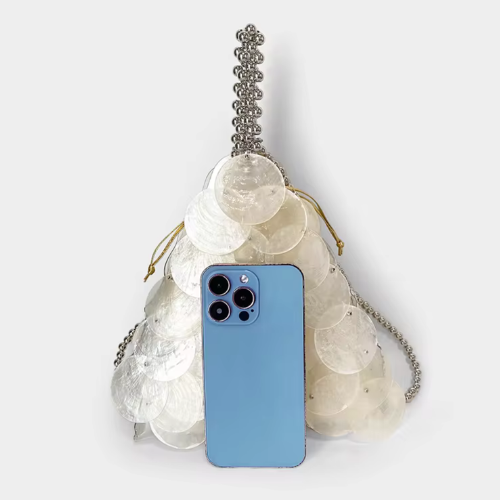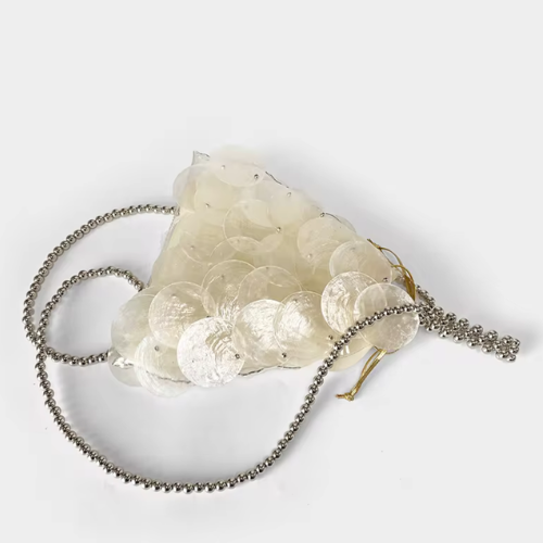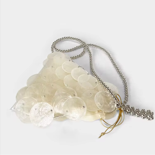 Make a shimmering statement with this shell-disc crossbody bag, designed with layered iridescent discs that catch the light from every angle. Its triangular silhouette gives it a bold, modern edge while the silver ball-chain strap adds glam and texture. Spacious enough to fit your phone and small essentials, this bag is perfect for festivals, vacations, beach dinners, and standout night-out looks.
