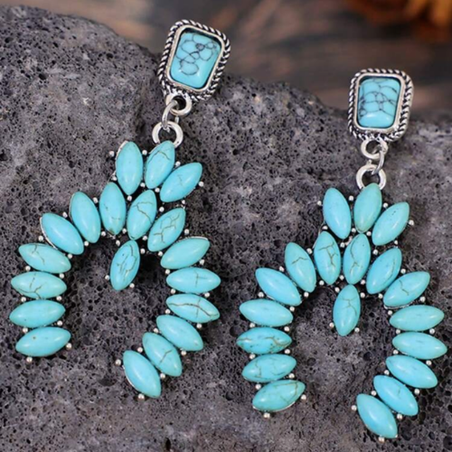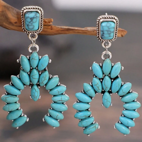 Bold turquoise statement earrings with a silver-tone setting and horseshoe shape—vibrant, artistic, and perfect for boho styling.